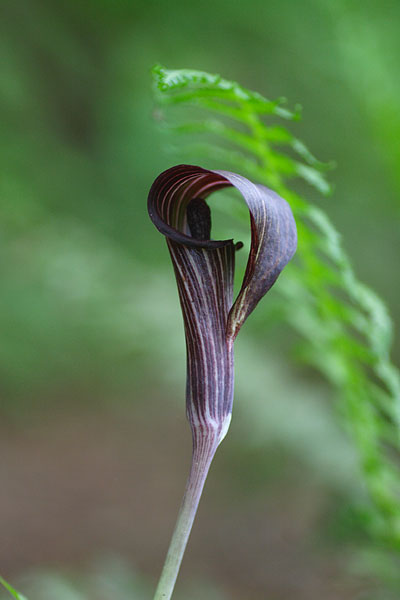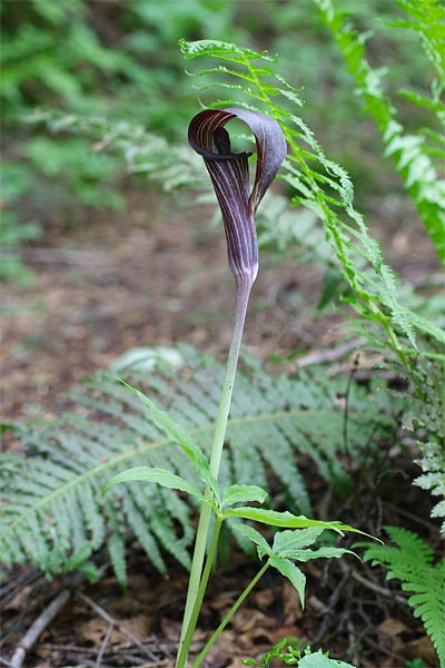 で、お目当てのクボタテンナンショウ。ユモトマムシグサの変種で、仏炎苞が濃紫褐色になるのが特徴なんだそうですが、この近辺には中間的な色合いのユモトマムシグサもあって、どうなのかな、って感じです。ただ、普通のユモトマムシグサよりは花期が半月遅いですね。