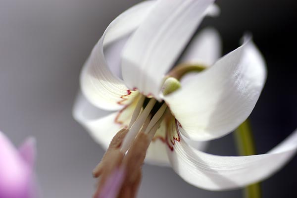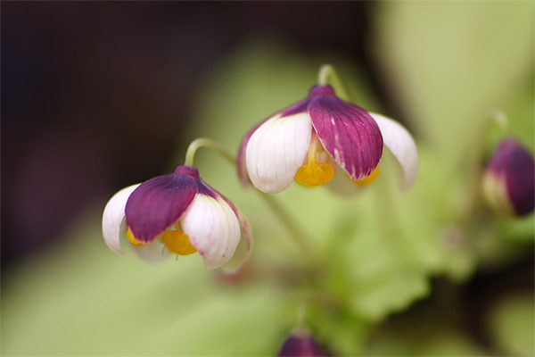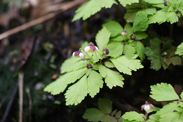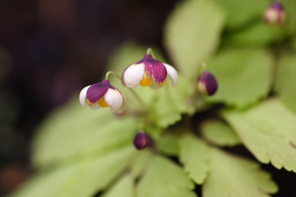 キンポウゲの仲間、というのがポイントですね。この仲間は、一見花弁に見える部分が実はがくであるという特徴があります。このアズマシロカネソウも例外ではありませんで、花弁のように見える白と紫のものは実はがくなんです。その内側にわずかに見えている黄色いのが、花弁なんですね。