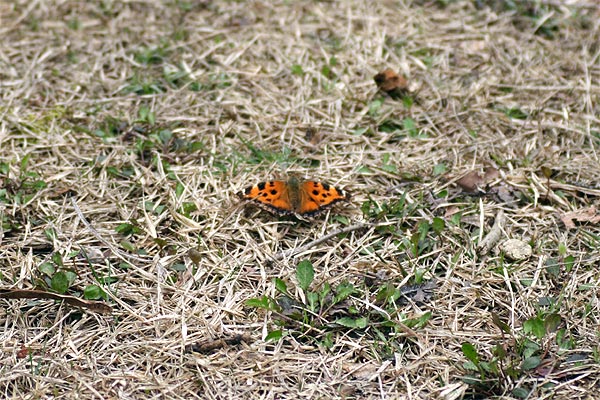 現場では「キタテハかなんかかな」という程度の認識しかなかったんですが、うちに帰ってから調べてみたら、どうやらヒオドシチョウの越冬個体のようなんですね。