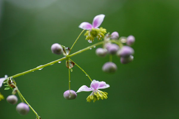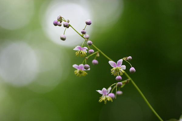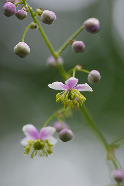 ちょっと専門的な話になってしまいますが、カラマツソウの仲間というのは花が咲くとすぐにがく片が落ちてしまい(早落性というそうです)、おしべばかりが目立つ独特の姿になってしまうのですが、このシキンカラマツは開花後もがく片が落ちないため、黄色のおしべと薄紫のがく片のコントラストがたいへん美しく、おしべの黄色を金に見立て、紫と金で「紫金落葉松」と呼ぶのだそうで御座候。