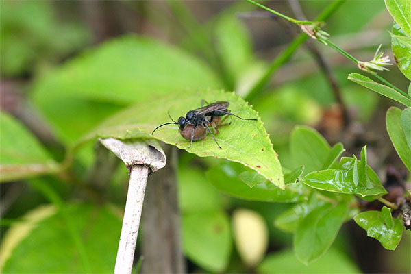 おそらくオオモンクロベッコウという狩人蜂だと思うんですが。この仲間はクモを狩るんですが、自分よりも大きな獲物を狩ることが多く、このベッコウバチも獲物が重たすぎて飛べませんでした。