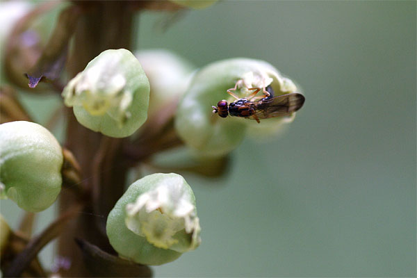 オニノヤガラにも結構ムシがたかってたんで、蜜なんか出したりするのかなぁと思ってたら、どうも様子がおかしいんです。よく見てると、細長い胴を花の中に突っ込んでナニやらやってるんですね。