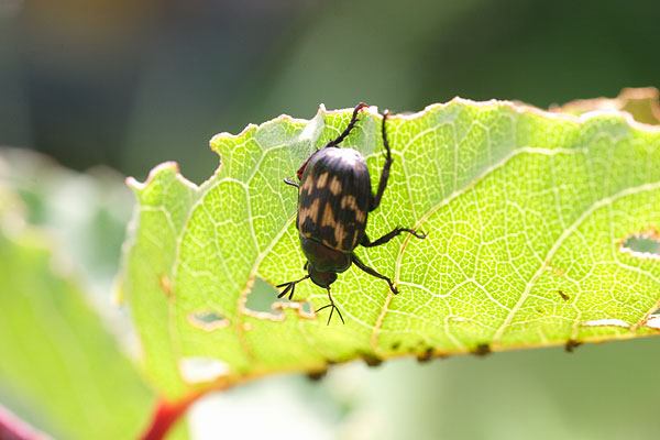 マメコガネ。豆の害虫なのでこう呼ばれてるそうですが、実はいろんな植物を食います。こやつがアクロバットしているのは柳の仲間です。
