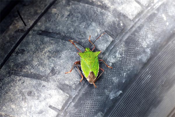 駐車場に戻ったら、車のタイヤにこんなんがいました。アオツノカメムシだそうで、おもろい顔してます(^^)