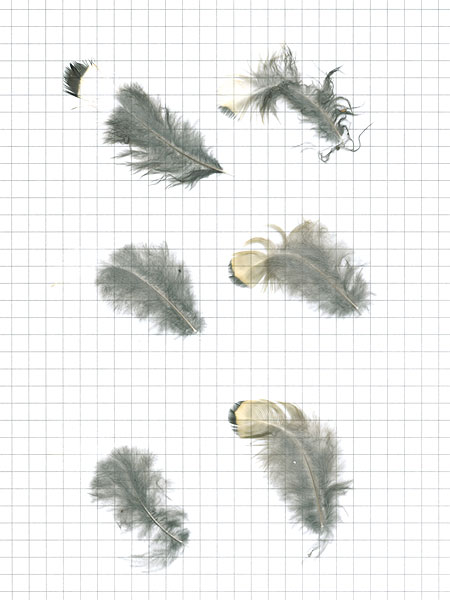 これを拾った場所には血の付いた体羽も落ちてましたんで、猛禽がここで羽をむしった可能性がありますね。ただ、翼の羽は全然なかったので、料理の途中でどこかへ移動したものと思われまうす。