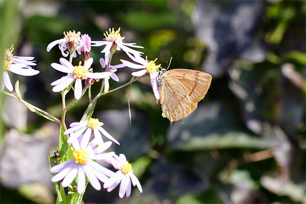 いつだったか、F先生とご一緒させていただいたときに教わった、きれいなシジミチョウです。今日はなんと目の前のノコンギク(?)で吸蜜してくれました。