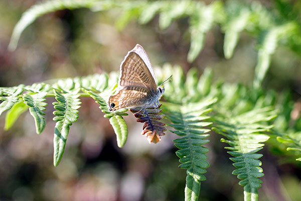 羽根を半ば広げて、まるで日光浴してるかのようなウラナミシジミ。