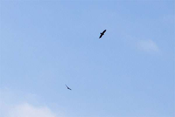 「よっくらせ」と背筋を伸ばしてみれば、やたらでっかいタカが2羽、上昇してくるところでした。