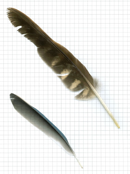 で、下は某所-Bでひろったオナガの羽。青灰色の部分がかすかに見えてますね。