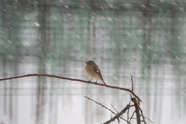 一際激しく降る雪の中、オオブタクサの実をついばむシジュウカラの群れと梢で小声で囁くヤマガラ、コガラ、エナガ……のみ。