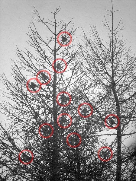 しかし、あのツグミたちはカラマツで何をやっていたんでしょうかねぇ。近くには雪のしのげそうなスギ林とかもあったのに。